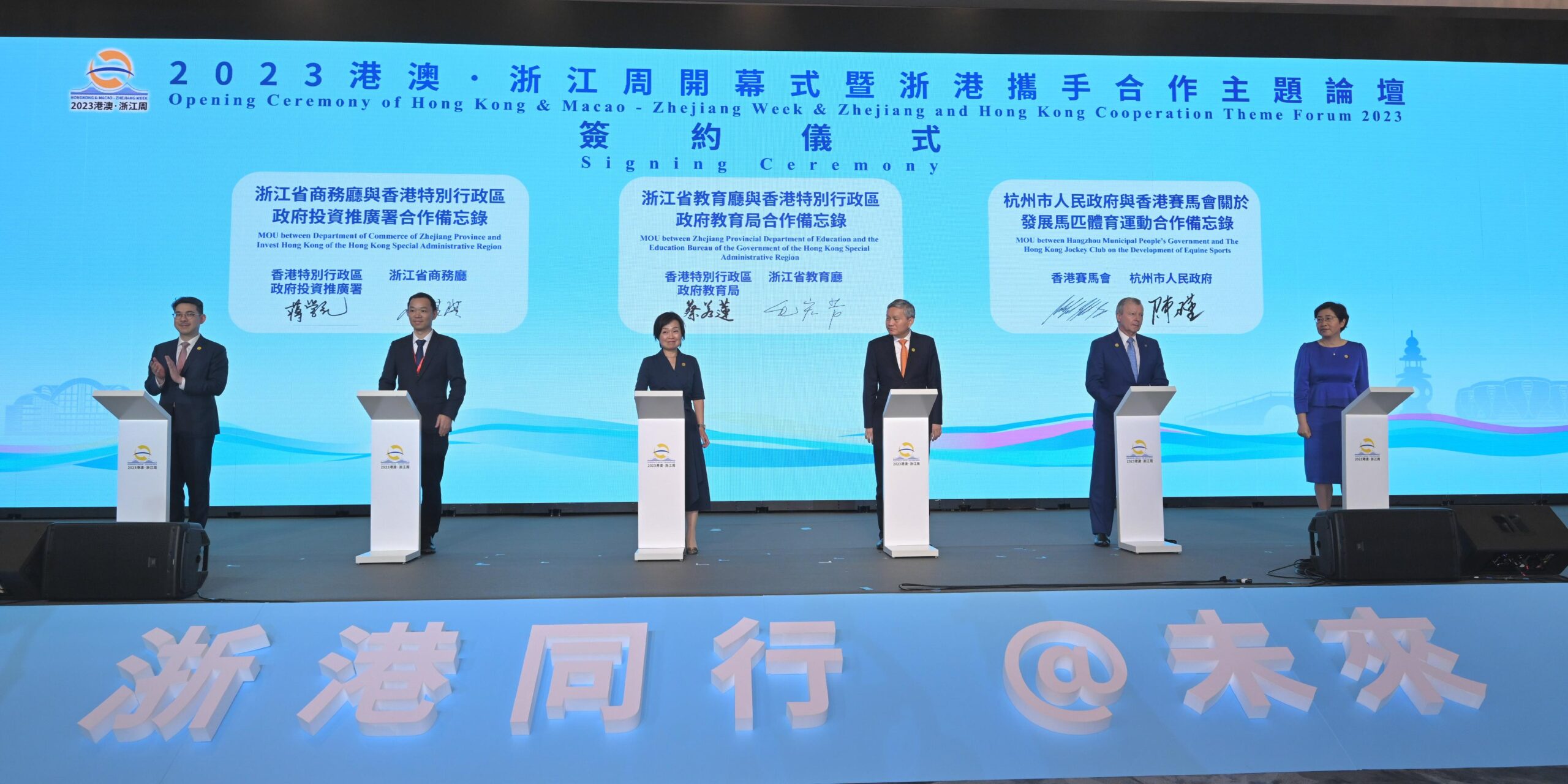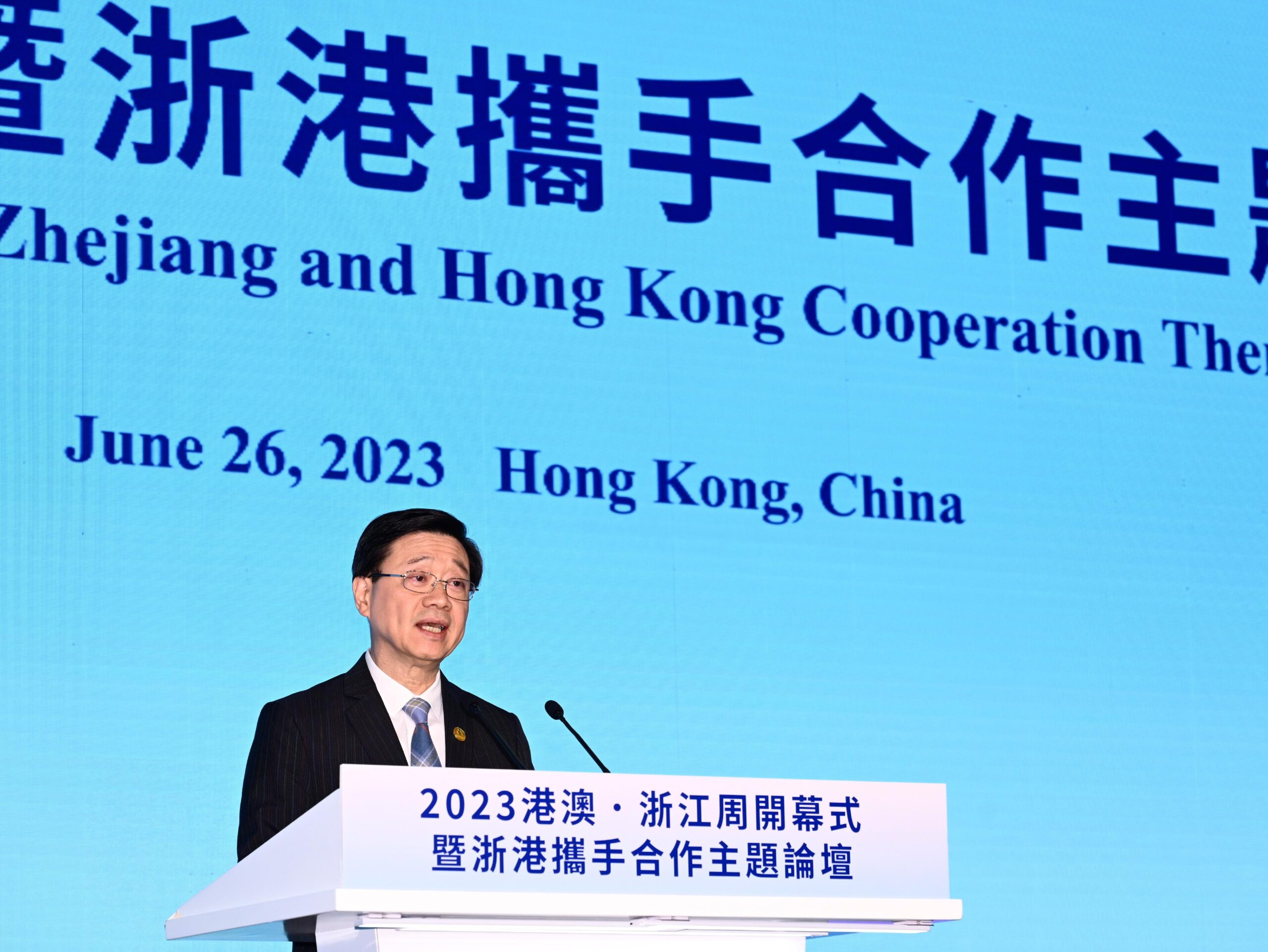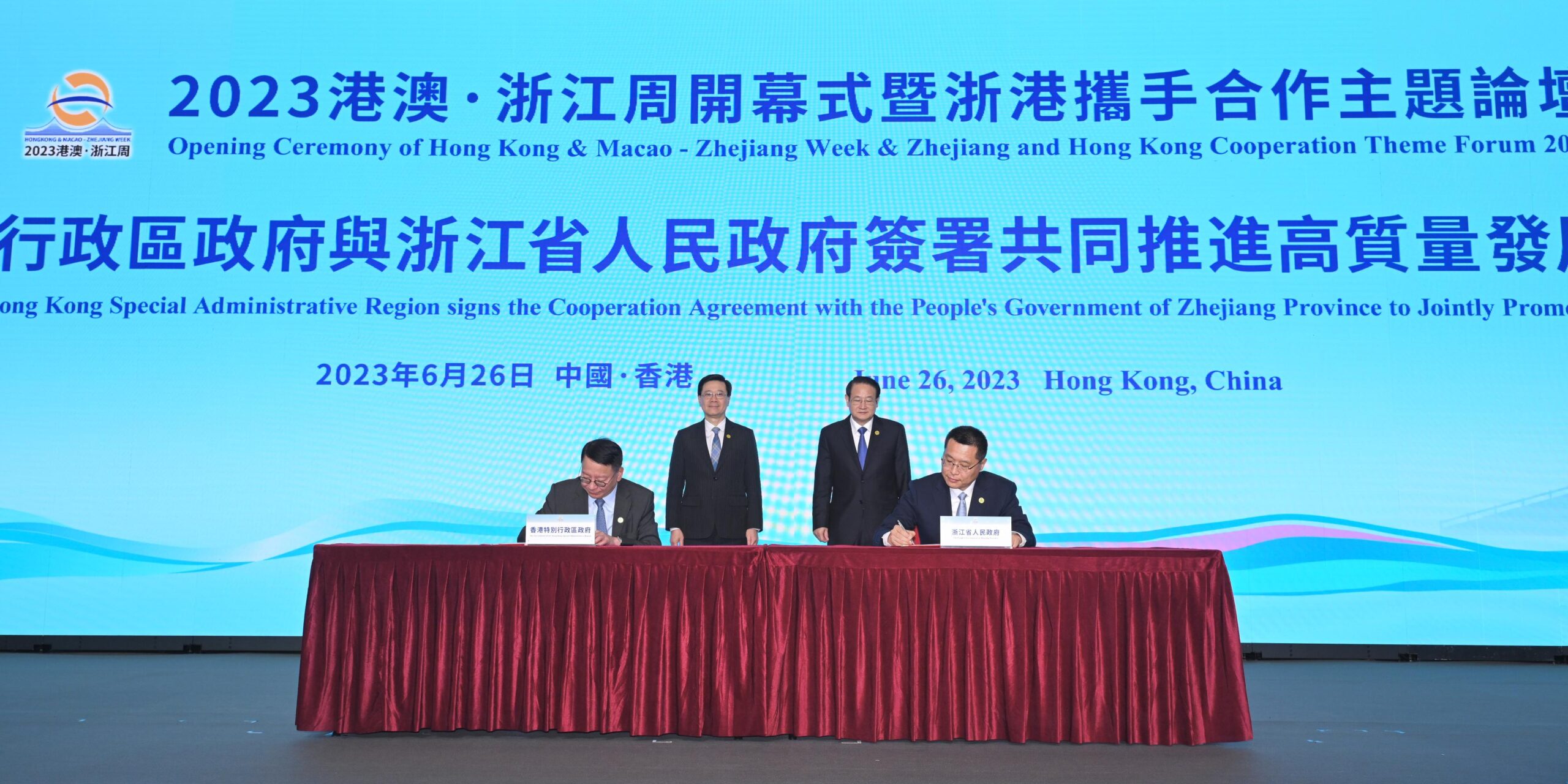 The Chief Executive, Mr John Lee, attended the Opening Ceremony of Hong Kong & Macao – Zhejiang Week & Zhejiang and Hong Kong Cooperation Theme Forum 2023 in Hong Kong today (June 26). At the opening ceremony, Mr Lee, and the Secretary of the CPC Zhejiang Provincial Committee, Mr Yi Lianhong, jointly witnessed the signing of a number of co-operation agreements between Zhejiang and Hong Kong for promoting complementarity and mutual benefits and achieving high-quality development of the two places.