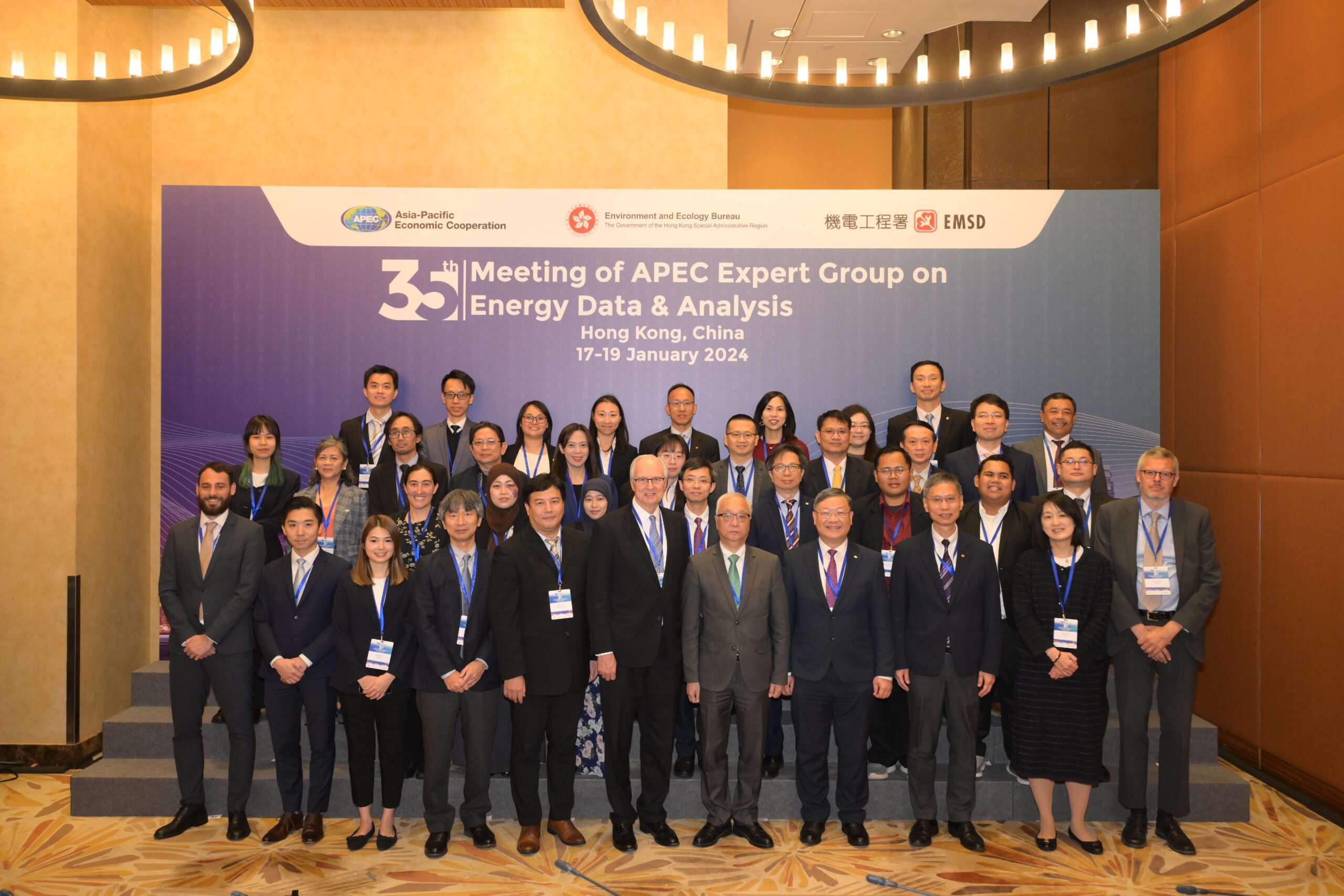 亞太區經濟合作組織能源數據及分析專家小組第35次會議今明兩日(一月十七日及十八日)在香港舉行。圖示環境及生態局局長謝展寰(第一排右五)與出席者合照。