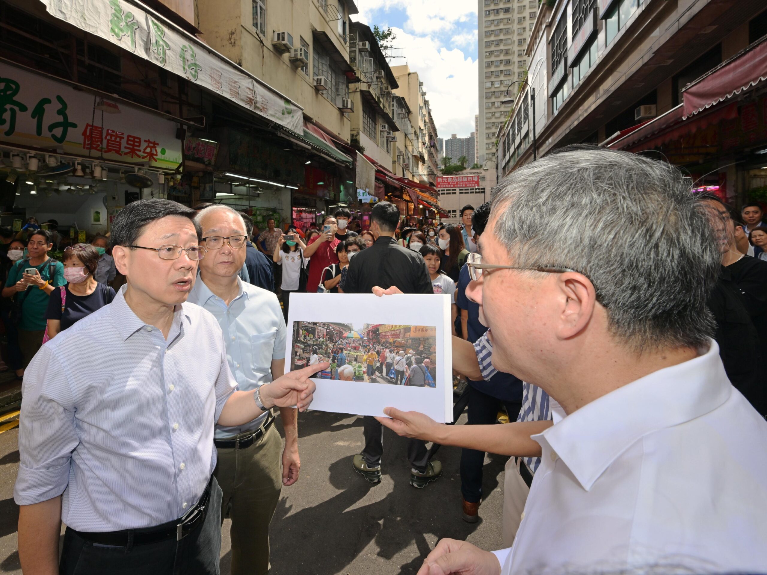 其後,李家超視察元朗新街的衞生黑點,了解食物環境衞生署和警務處聯合打擊店鋪阻街的成效。他又與市民傾談,了解他們的日常生活情況,並很高興聽到市民對當地衞生改善成果的正面評價和支持政府的做法。