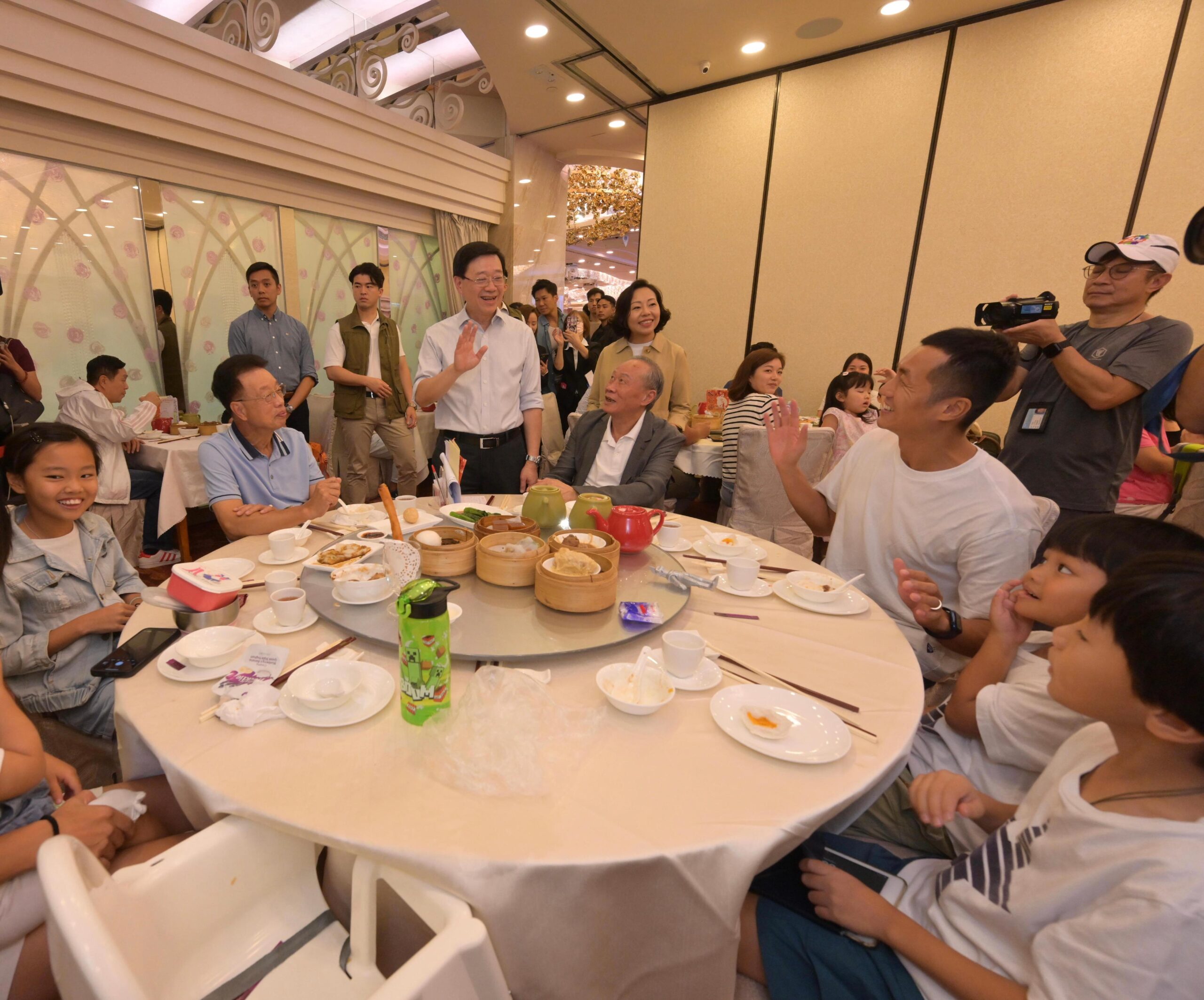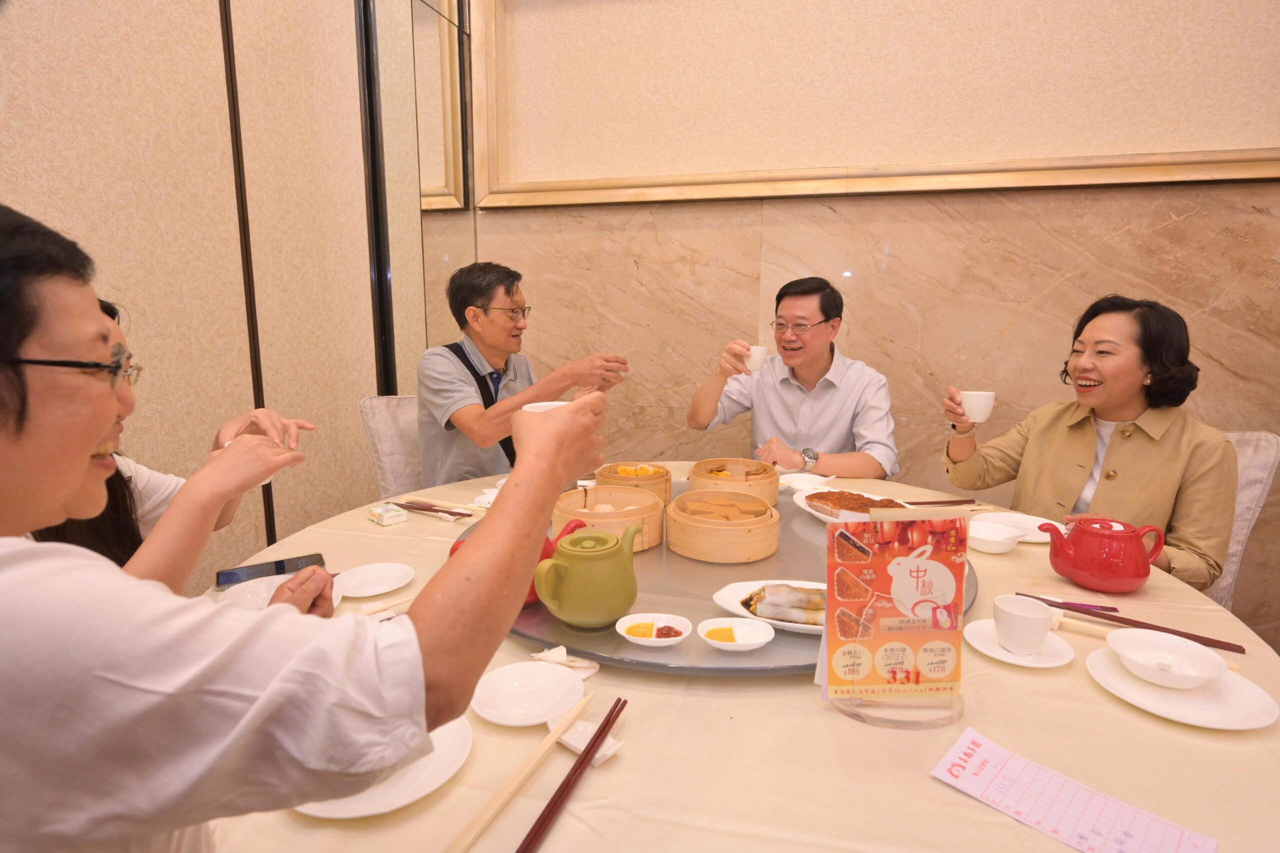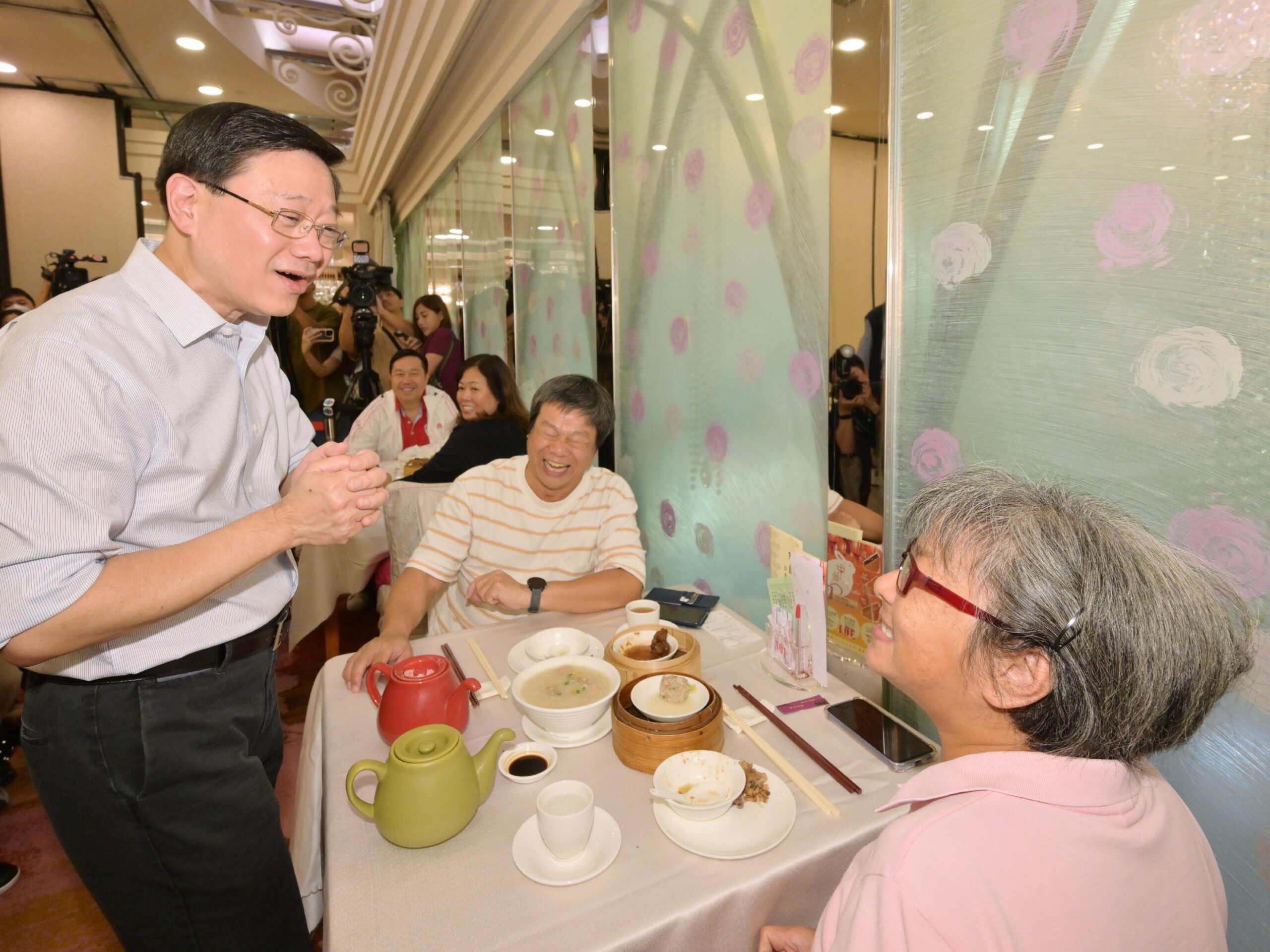 李家超一行之後到區內一間酒樓,與喝早茶的市民交流,聽取他們對新一份《施政報告》的想法。