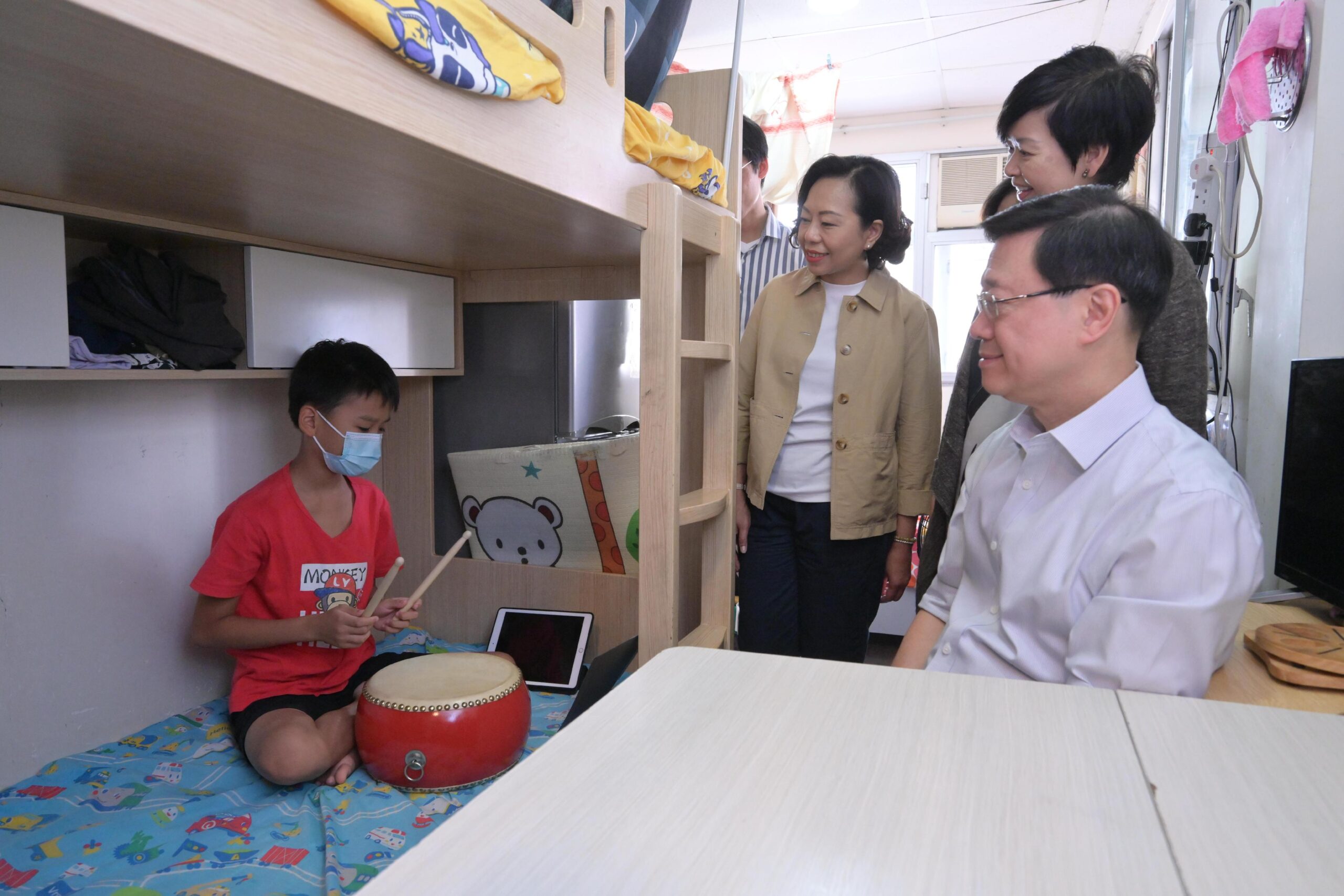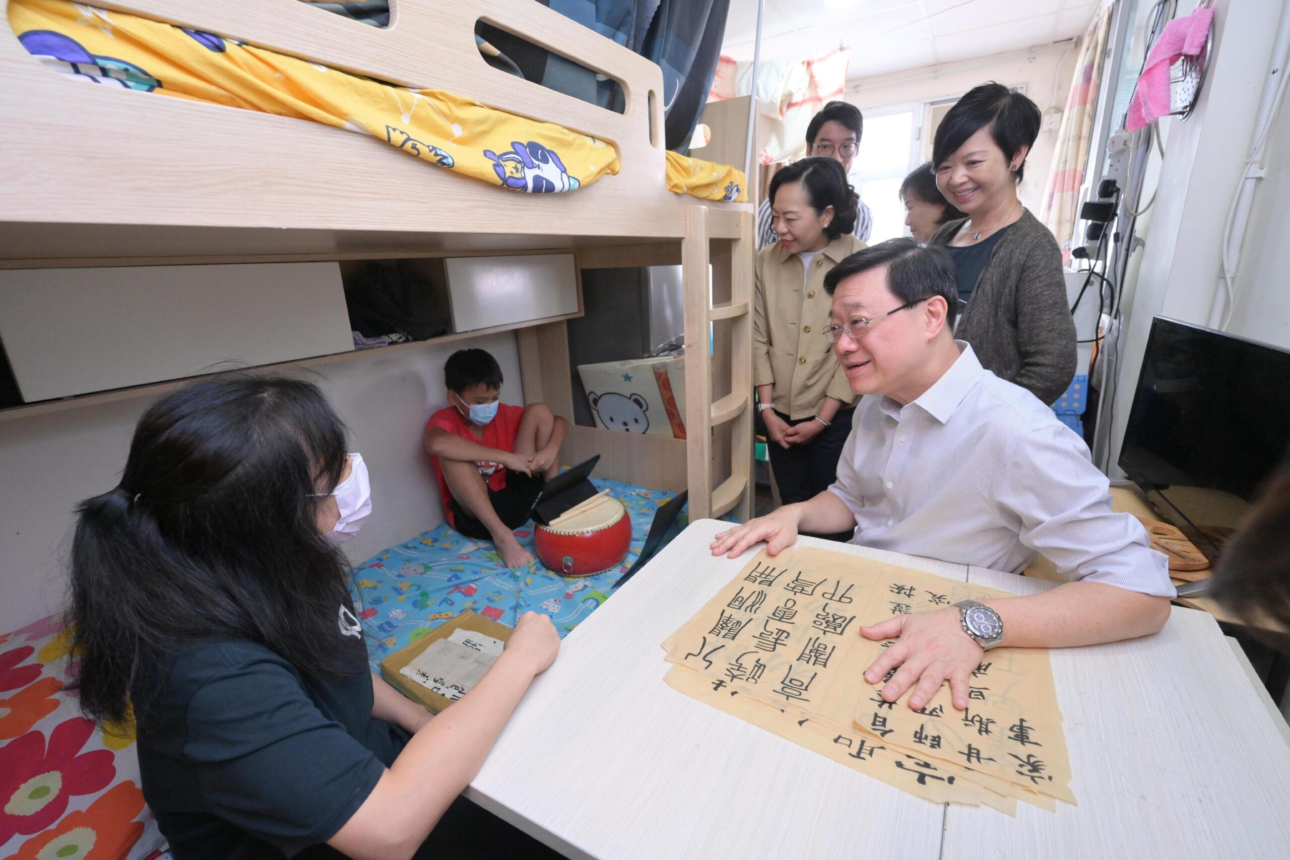 行政長官李家超今日(九月十七日)到訪元朗區就新一份《施政報告》聽取市民意見。圖示李家超(前排右一)在房屋局局長何永賢(後排右一)和民政及青年事務局局長麥美娟(後排右二)陪同下,探訪居住於「劏房」的基層家庭,了解其生活狀況。
