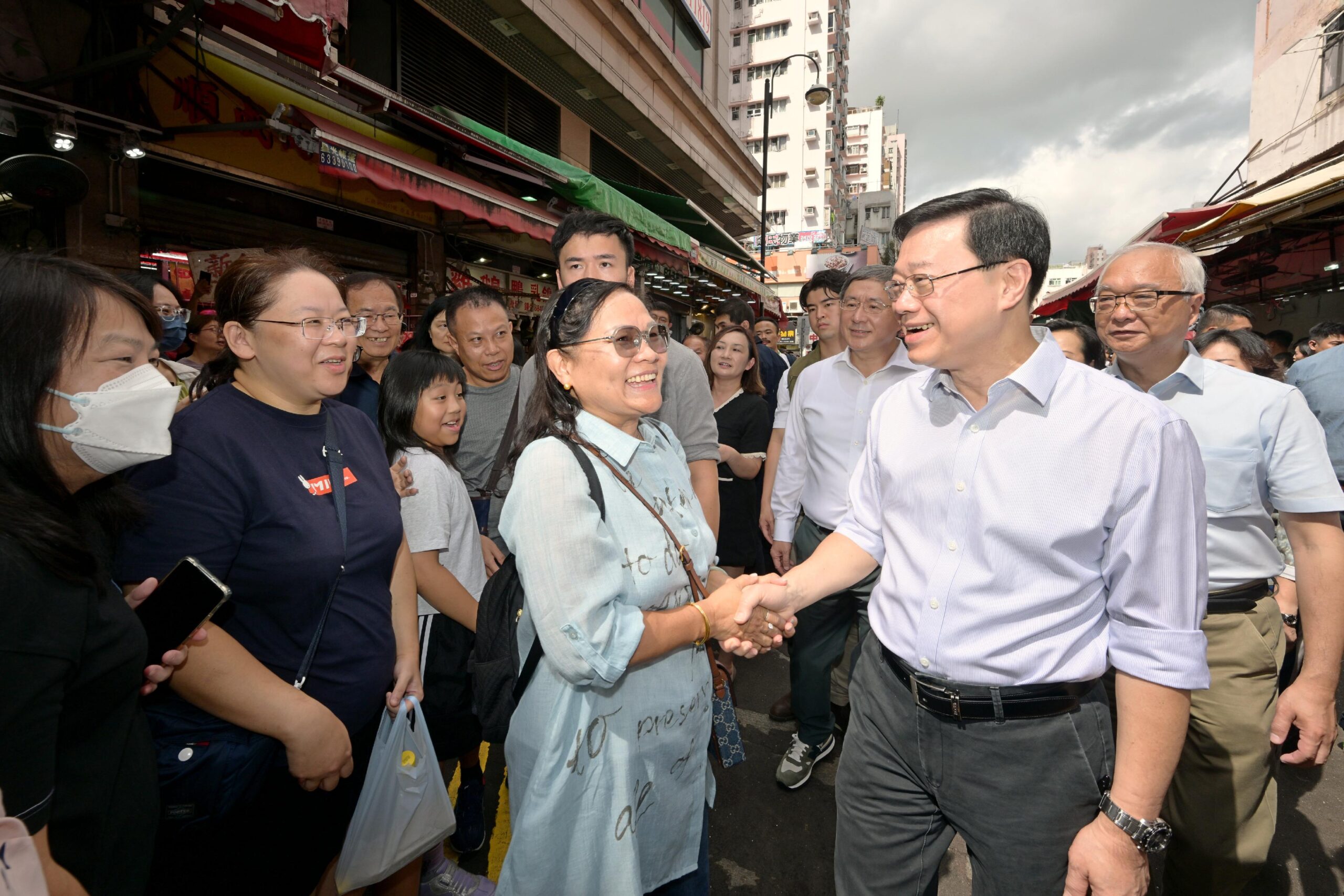 行政長官李家超今日(九月十七日)到訪元朗區就新一份《施政報告》聽取市民意見。圖示李家超(右二)和民政及青年事務局局長麥美娟(右一)與市民交流,聽取他們對新一份《施政報告》的想法。