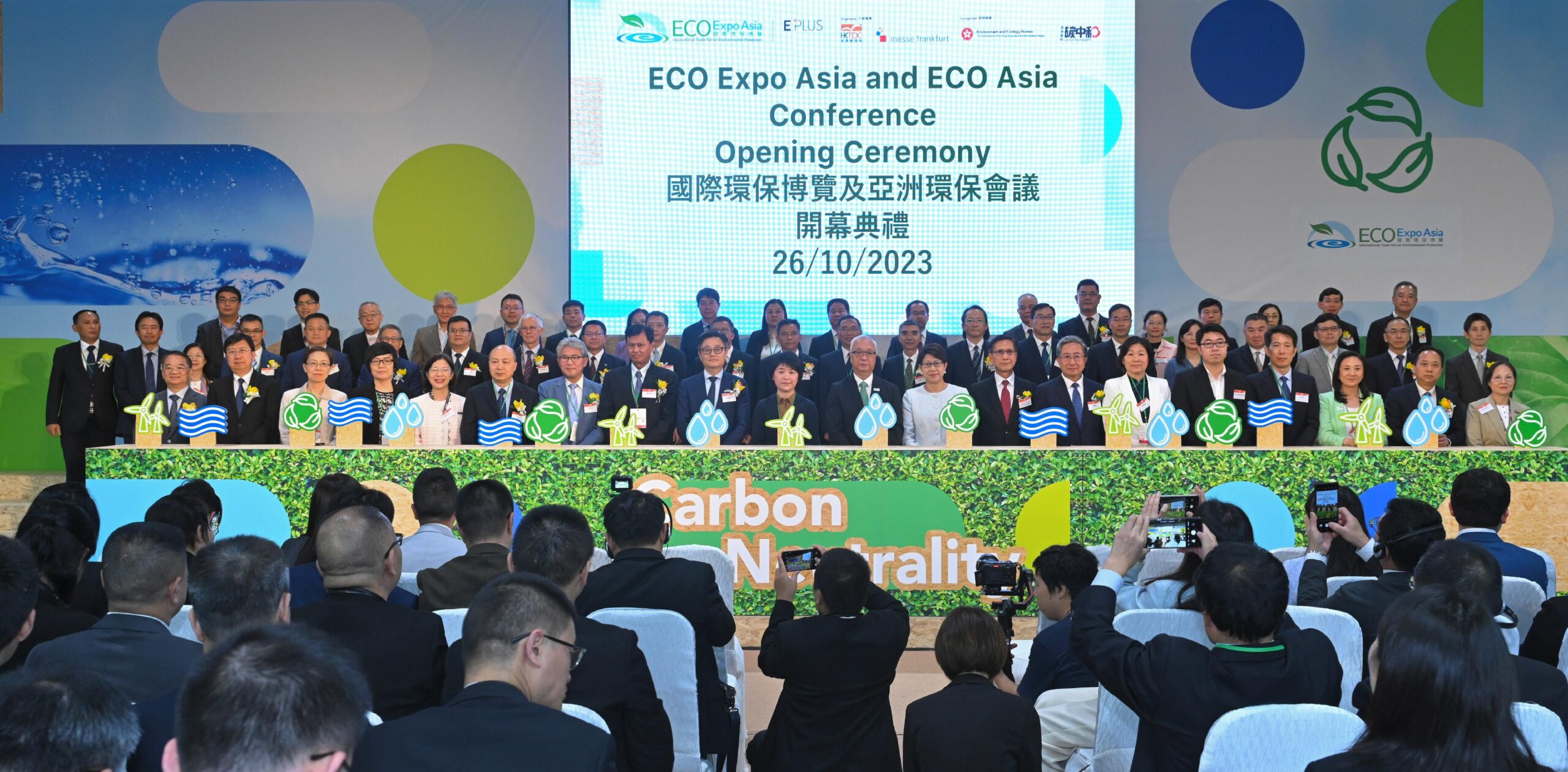 國家生態環境部副部長郭芳(前排左十)、環境及生態局局長謝展寰(前排右十)、環境及生態局常任秘書長(環境)謝小華(前排左五)與其他主禮嘉賓今日(十月二十六日)在亞洲國際博覽館主持第十八屆國際環保博覽開幕典禮。