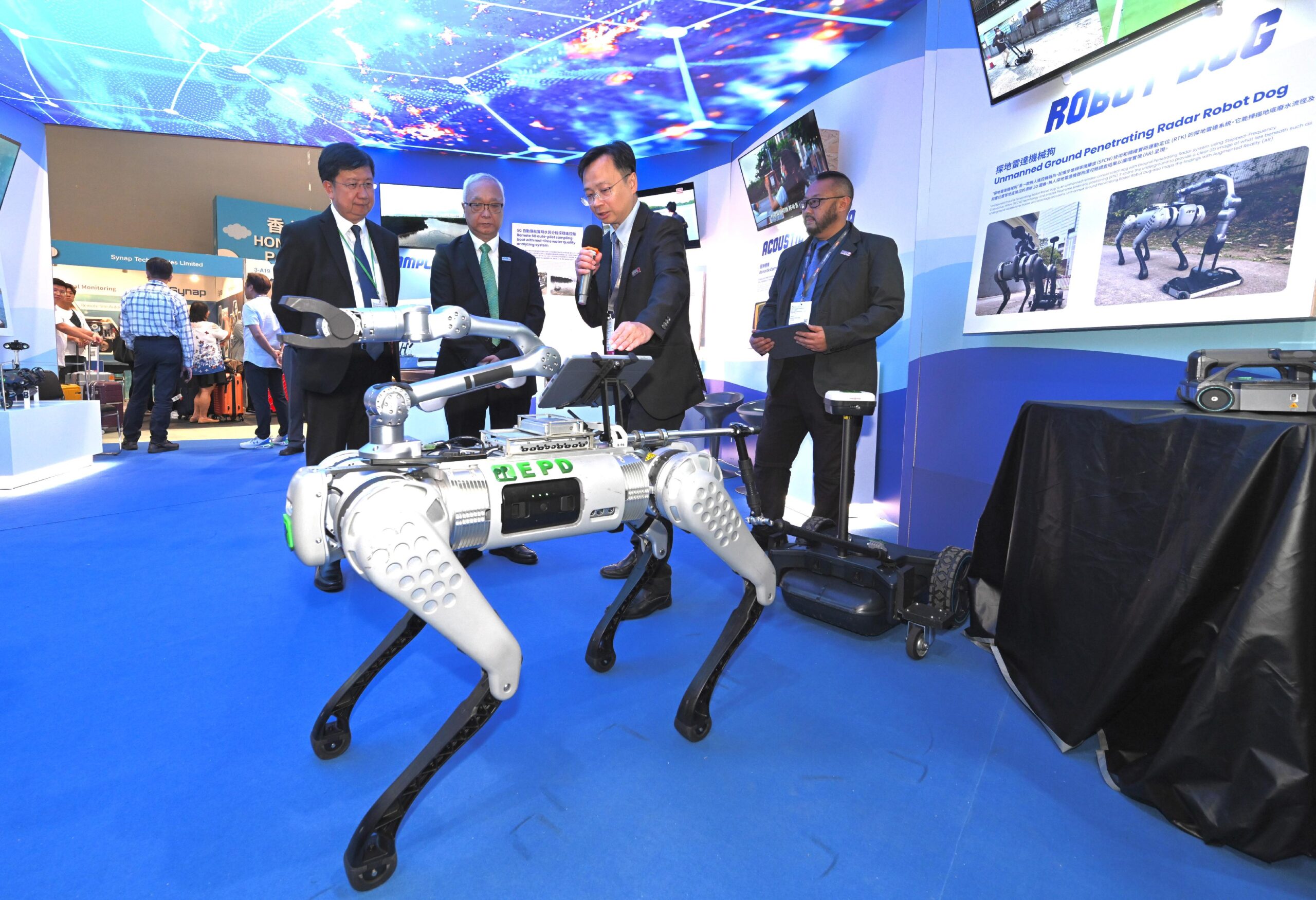 環境及生態局局長謝展寰(左二)今日(十月二十六日)參觀由環境及生態局在第十八屆國際環保博覽中所設的實體展區,在「綠色科技」展區了解探地雷達機械狗的運作。