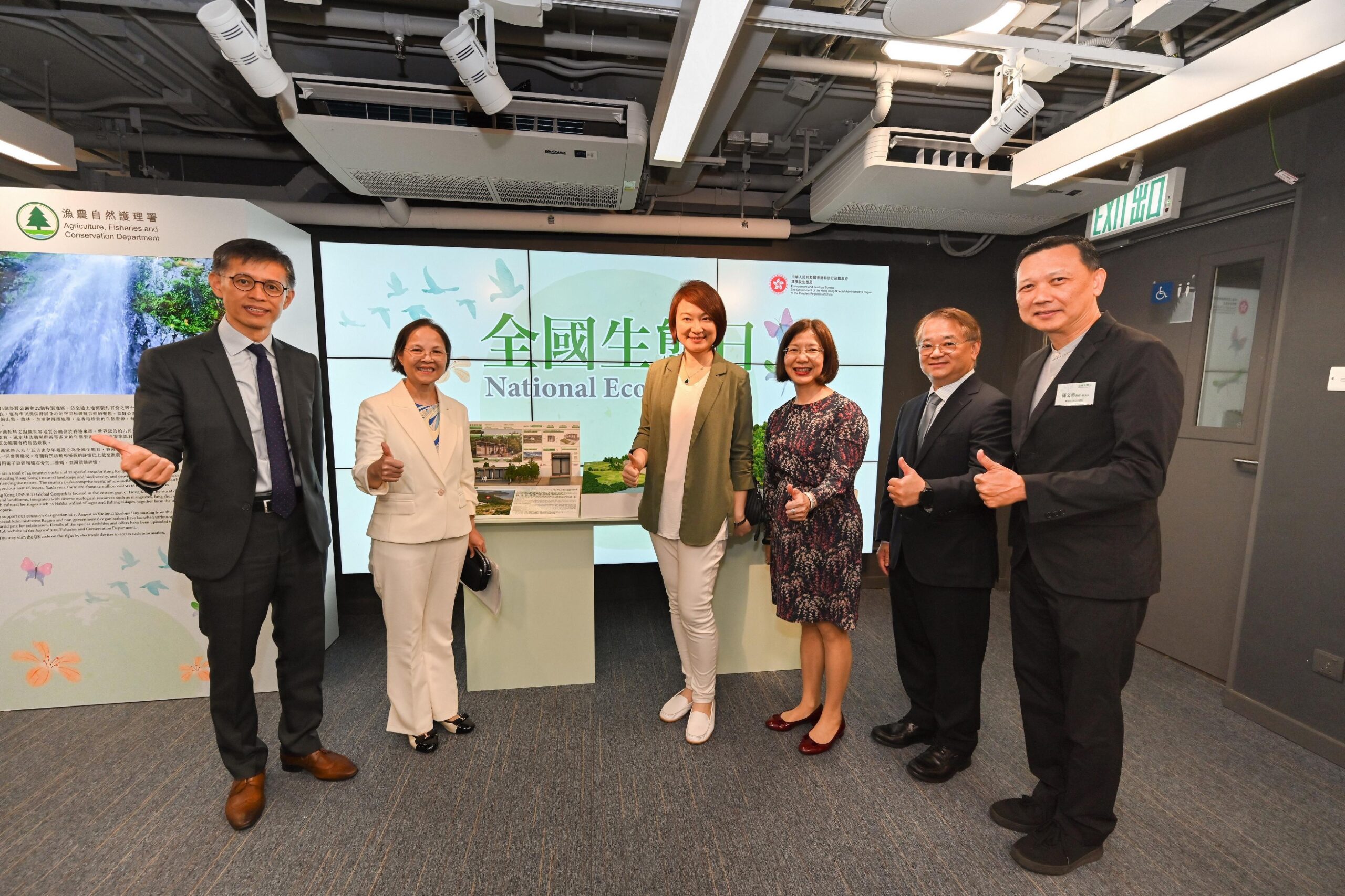 香港特別行政區政府今日(八月十五日)舉辦全國生態日啓動禮,以響應國家由今年起將八月十五日設立為全國生態日,向社會宣揚生態文明建設和環境保護行動自覺的重要性。圖示署理環境及生態局局長黃淑嫻(左二)、第十四屆全國人民代表大會常務委員會委員和立法會議員李慧琼(右四),以及其他嘉賓參觀位於啓動禮場地內有關自然及鄉郊保育的展覽。