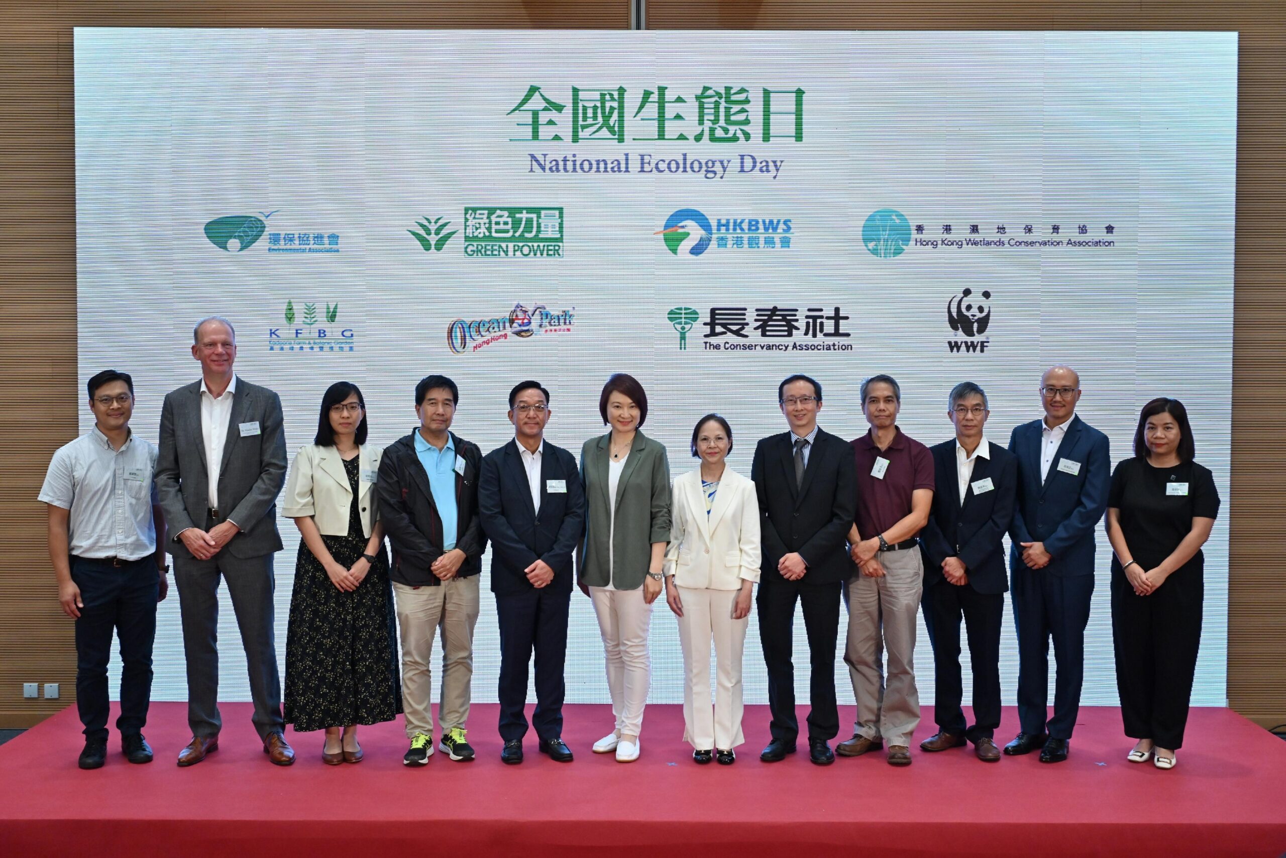 香港特別行政區政府今日(八月十五日)舉辦全國生態日啓動禮,以響應國家由今年起將八月十五日設立為全國生態日,向社會宣揚生態文明建設和環境保護行動自覺的重要性。圖示署理環境及生態局局長黃淑嫻(右六)、第十四屆全國人民代表大會常務委員會委員和立法會議員李慧琼(左六)、新界鄉議局主席劉業強(左五)和署理天文台台長李立信(右五)與支持全國生態日公眾參與活動的八間機構代表拍照留念。