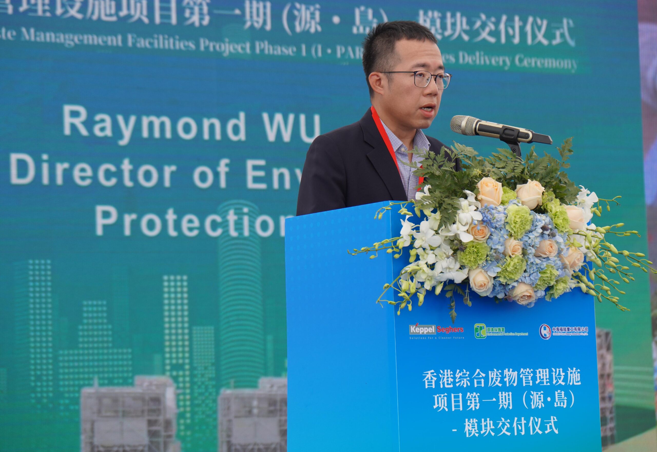 本港首座處理都市固體廢物的轉廢為能設施(I·PARK1)的預製組件製造工程順利完成。環境保護署副署長胡偉文今日(一月十九日)在位於珠海的廠房出席巨型機電設備預製組件的竣工交付儀式。圖示胡偉文在儀式上致辭。