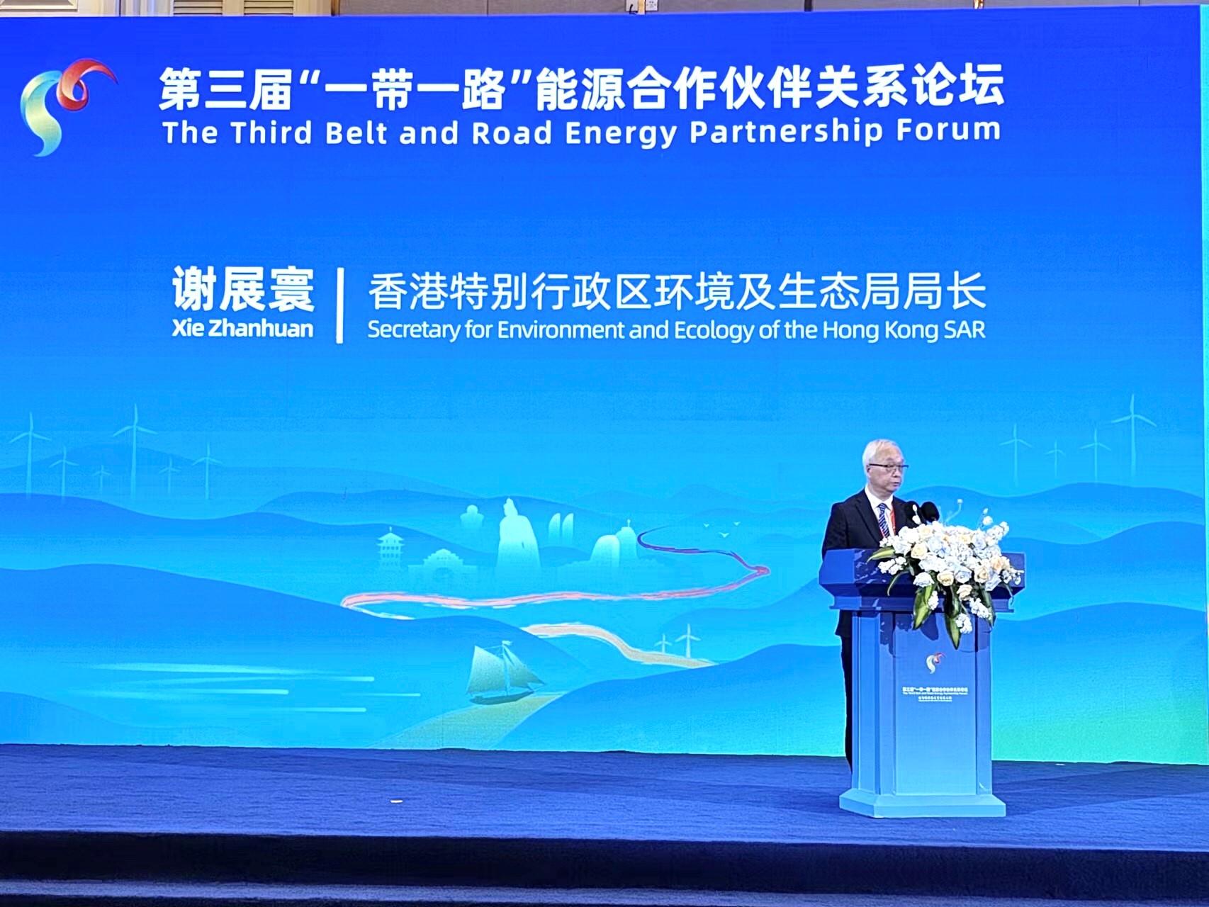 環境及生態局局長謝展寰今日(五月二十四日)在廈門出席第三屆「一帶一路」能源合作伙伴關係論壇,探討維護能源安全及能源綠色轉型等合作議題。