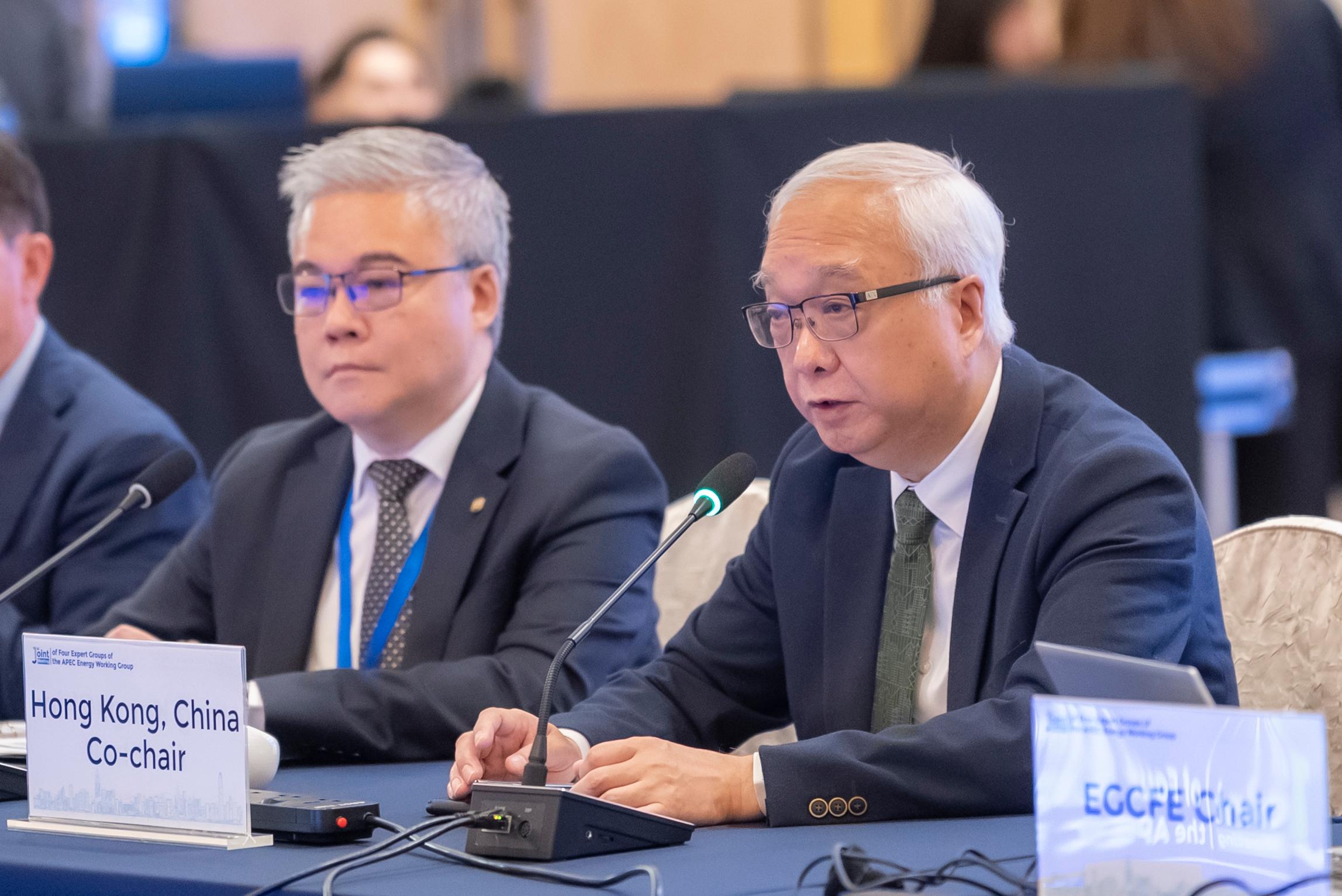 潘國英在會議上分享香港在能源方面的發展。他感謝亞太經合組織各成員經濟體為應對氣候變化持續作出的努力,以及強調各成員經濟體仍須保持緊密合作,應對氣候變化帶來的挑戰。